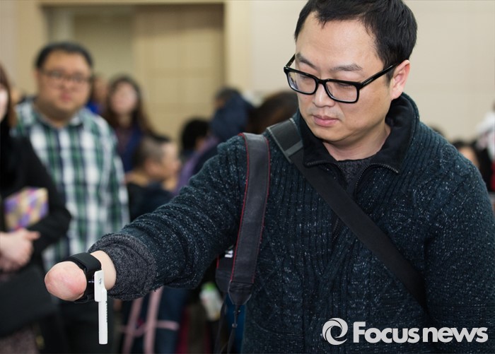 (서울=포커스뉴스) 16일 오후 서울 영등포구 이룸센터에서 열린 '20대 총선 거동불편유권자 대상 사전투표 모의 체험행사'에 참석한 장애인 유권자가 손목활용형 기표용구를 착용하고 있다.