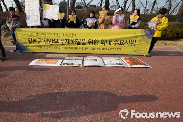 (청주=포커스뉴스) 16일 오후 충북 청주시 청원구 청주대학교 정문 앞에서 열린 일본군 위안부 문제 해결을 위한 1222차 학내 동시다발 수요시위에서 학생들이 한일 위안부 합의를 반대하는 피켓을 들고 있다.