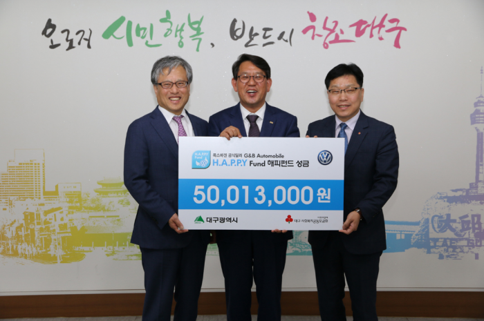 (서울=포커스뉴스) 폭스바겐 공식딜러 지엔비오토모빌이'H.A.P.P.Y(Help All People Please You) 펀드'를 통해 마련한 성금 5001만3000원을 대구사회복지공동모금회에 전달했다고 16일 밝혔다.