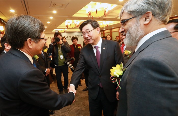 (서울=포커스뉴스) 이기권 고용노동부장관은 16일 오후 서울 중구 프레스센터에서 열린 고용허가제 송출국 대사 간담회에서 참석한 대사들과 인사를 나누고 있다. <사진제공=고용노동부>