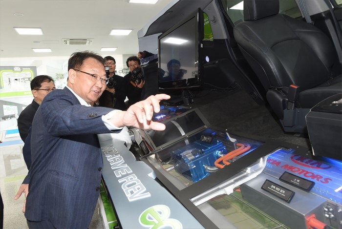 (광주=포커스뉴스) 유일호 부총리 겸 기획재정부 장관이16일 지역전략산업 육성을 위한 규제프리존 도입과 관련 광주광역시를 첫 현장 방문, 그린카진흥원 수소융합스테이션에서 관계자의 설명을 듣고 있다. <사진제공=기획재정부>