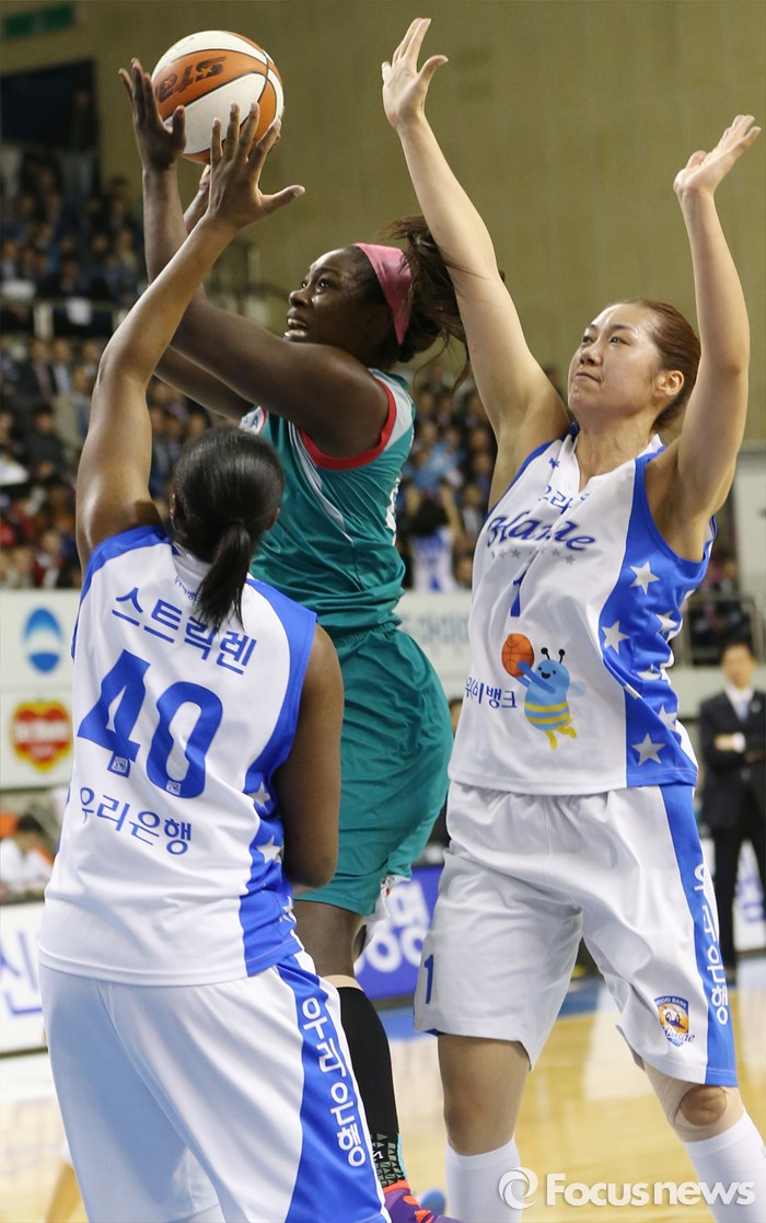 KEB하나은행은 김정은이 12득점으로 힘을 냈지만 승부를 돌리기에는 역부족이었다. 첼시 리(7득점)와 모스비(6득점)의 부진이 뼈아팠다.(춘천=포커스뉴스) 춘천호반체육관에서 열린 2015~2016 여자프로농구 우리은행-KEB하나 챔피언결정전 1차전에서 KEB하나 첼시 리가 우리은행 스트릭렌과 양지희의 마크를 뚫고 점프슛을 시도하고 있다. 2016.03.16 우정식 기자