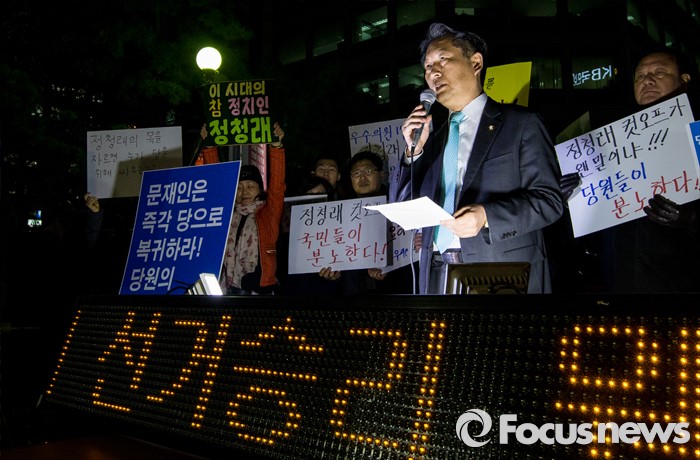 (서울=포커스뉴스) 20대 총선에서 공천배제된 정청래 더불어민주당 의원이 16일 오후 서울 여의도 당사 앞에서 가진 기자회견에서 자신의 거취를 밝히고 있다.