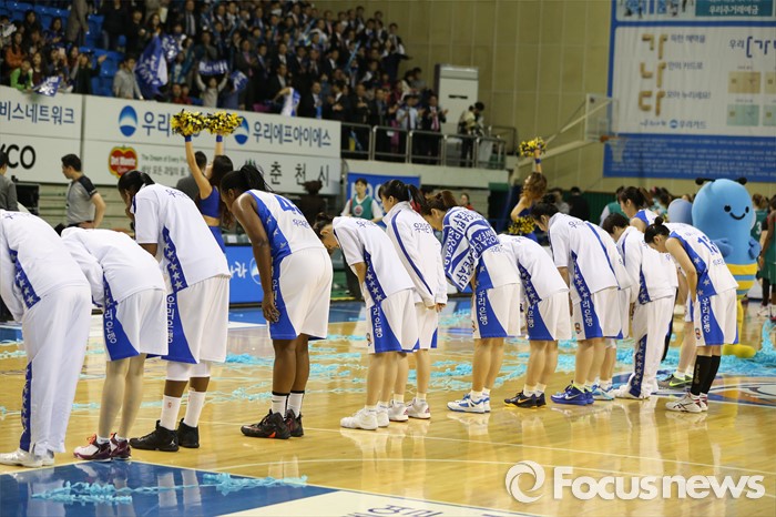 (춘천=포커스뉴스) 춘천호반체육관에서 열린 2015~2016 여자프로농구 우리은행-KEB하나 챔피언결정전에서 KEB하나를 물리치고 1차전을 승리한 우리은행 선수들이 관중에게 인사하고 있다.