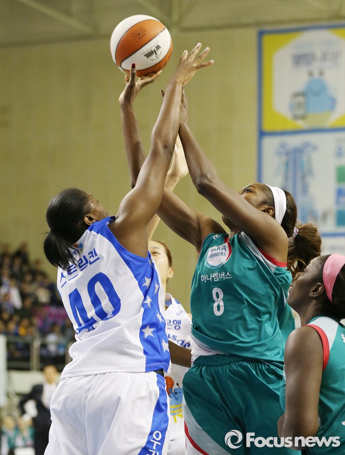 (춘천=포커스뉴스) 춘천호반체육관에서 열린 2015~2016 여자프로농구 우리은행-KEB하나 챔피언결정전 1차전에서 KEB하나 버니스 모스비가 우리은행 스트릭렌의 블록을 피하며 점프슛을 쏘고 있다.