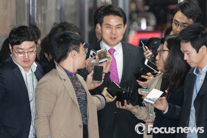 (서울=포커스뉴스) 김태호 새누리당 최고위원이 17일 오전 서울 여의도 국회에서 열린 최고위원회 간담회에 참석하며, 기자들의 질문에 답변하고 있다. 김무성 대표가 불참한 이날 새누리당 최고위 간담회에서는 원유철 원내대표와 일부 최고위원들이 참석해, 공천관리위원회의 의결과 관련해 논의하는 것으로 알려졌다.