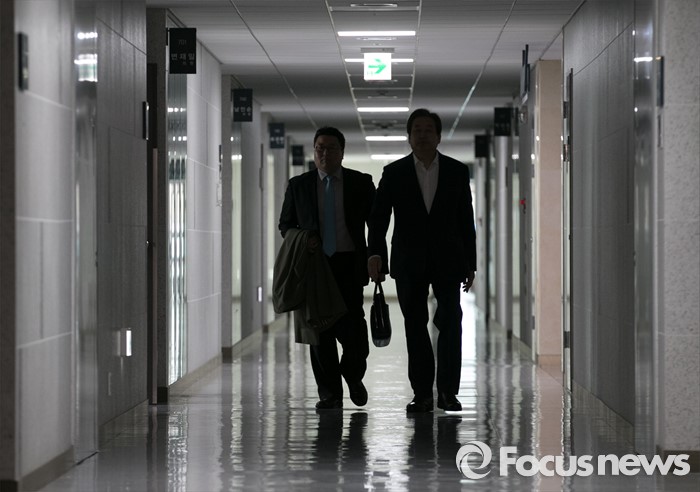 (서울=포커스뉴스) 김무성(오른쪽) 새누리당 대표가 17일 오전 서울 여의도 국회 의원회관 의원실로 출근하고 있다.