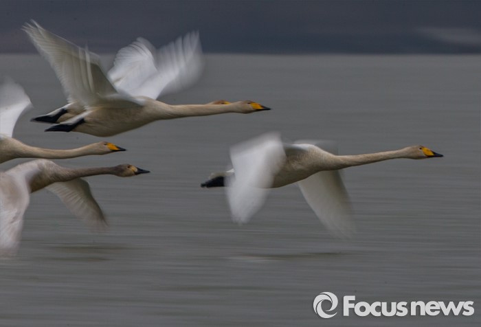 (하남=포커스뉴스) 한강에서 겨울을 보낸 큰고니(천연기념물201호)들이 16일 오후 고향인러시아,몽골로 떠나고 있다.