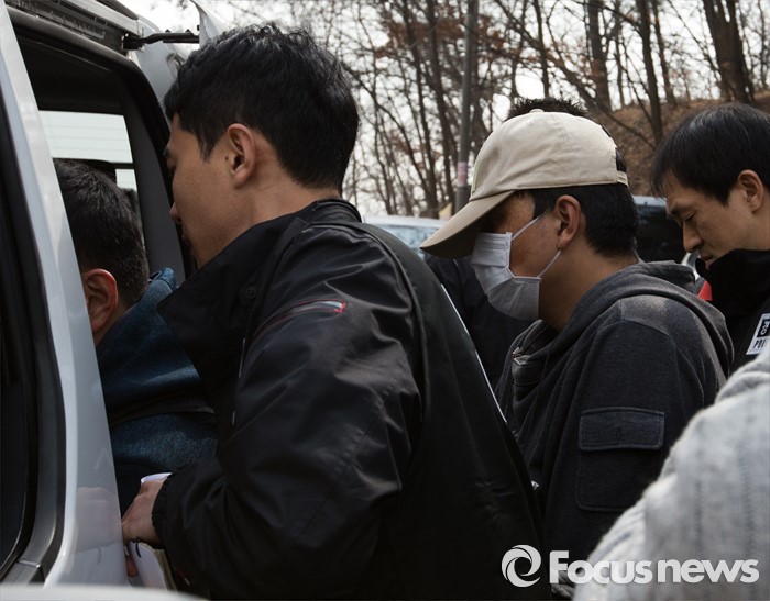 (시흥=포커스뉴스) 시각장애인 아버지를 살해 후 암매장한 아들 이모(37)씨가 17일 오전 경기도 시흥시 대야동 한 야산에서 현장검증을 마친 후 호송차에 타고 있다.