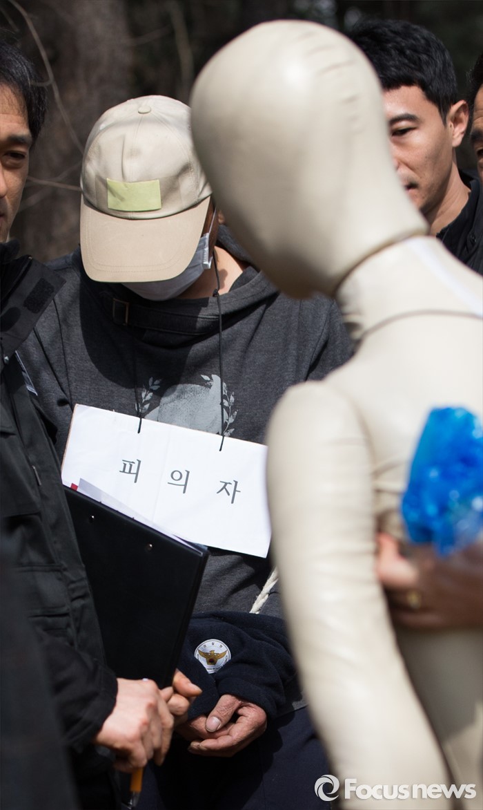 (시흥=포커스뉴스) 시각장애인 아버지를 살해 후 암매장한 아들 이모(37)씨가 17일 오전 경기도 시흥시 대야동 한 야산에서 현장검증을 하고 있다.