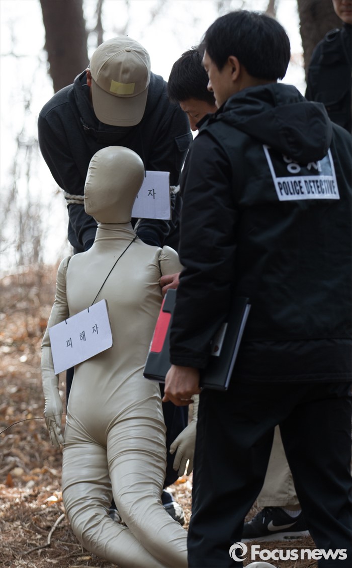 (시흥=포커스뉴스) 시각장애인 아버지를 살해 후 암매장한 아들 이모(37)씨가 17일 오전 경기도 시흥시 대야동 한 야산에서 현장검증을 하고 있다.