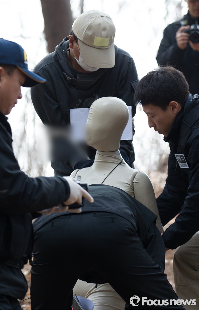 (시흥=포커스뉴스) 시각장애인 아버지를 살해 후 암매장한 아들 이모(37)씨가 17일 오전 경기도 시흥시 대야동 한 야산에서 현장검증을 하고 있다.