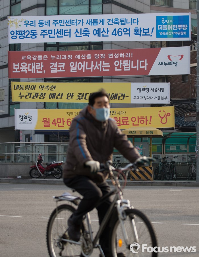(서울=포커스뉴스) 17일 오후 서울 영등포구 선유도역 주변에 다양한 주제를 담고 있는 각 정당들의 정책 홍보 현수막이 걸려 있다.