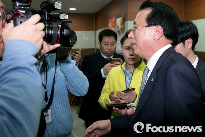 (서울=포커스뉴스) 새누리당 공천관리위원회 외부위원들이 김무성 대표의 사과를 요구하며 회의를 보이콧한 17일 오후 서울 여의도 당사에서 회의를 마친 김회선 위원이 취재진 질문을 받으며 나서고 있다.