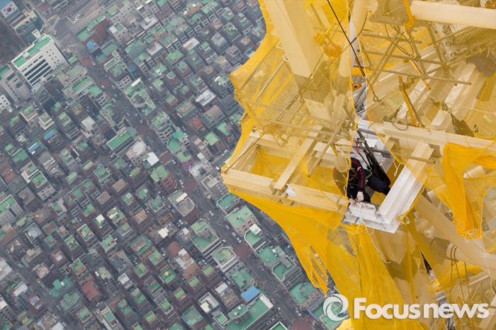 (서울=포커스뉴스) 17일 오후 서울 송파구 잠실 롯데월드타워가 최상층부의 첨탑 구조물 공사를 마치고 국내 최고 높이인 555m에 도달했다. 이날 공사 현장에서 인부들이 작업을 하고 있다.