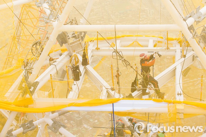 (서울=포커스뉴스) 17일 오후 서울 송파구 잠실 롯데월드타워가 최상층부의 첨탑 구조물 공사를 마치고 국내 최고 높이인 555m에 도달했다. 이날 공사 현장에서 인부들이 작업을 하고 있다.