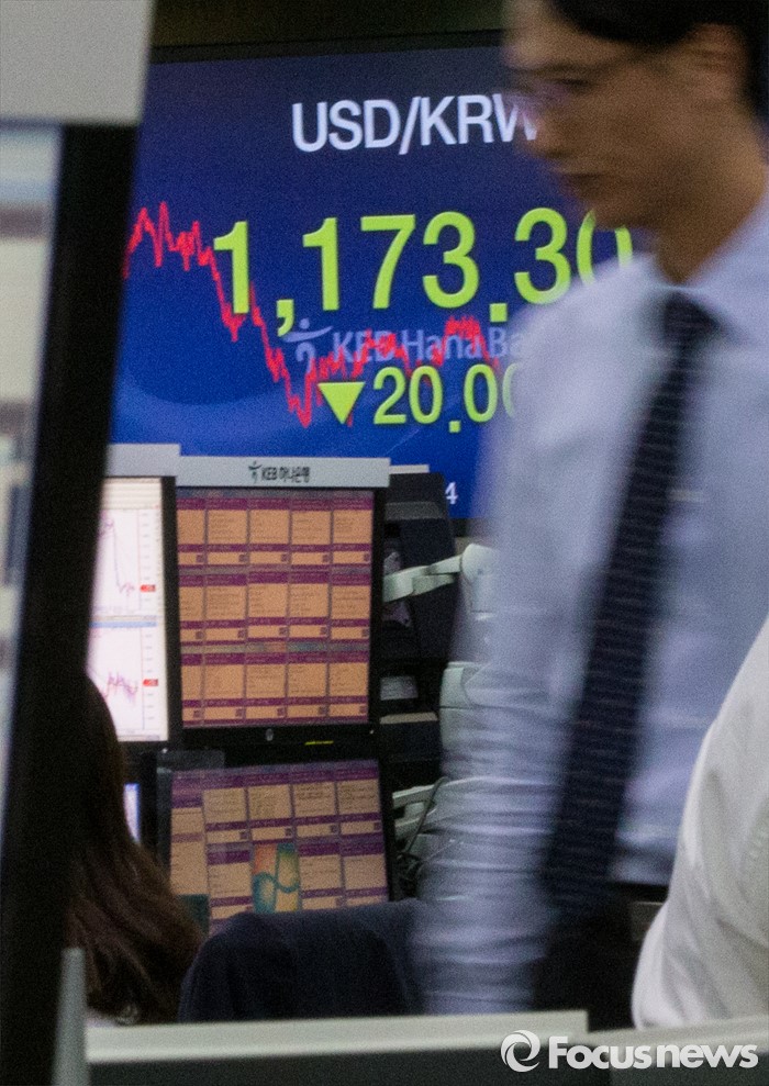 (서울=포커스뉴스) 17일 서울 중구 KEB외환은행 본점 딜링룸 전광판에 원달러환율이 전일 종가 대비 20원 내린 1173.3원를 나타내고 있다. 이날 코스피는 장중 2000선을 돌파했으며, 원·달러 환율은 전일 종가 대비 20원 내린 1173.3원으로 지난해 12월 30일(1172.5원) 이후 약 석달만에 종가 기준 1170원대를 기록했다.