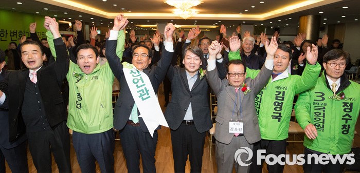 (청주=포커스뉴스) 17일 오후 충북 청주 흥덕구 리호관광호텔에서 열린 국민의당 충북도당 창당대회에서 안철수 공동대표와 후보자 및 당원들이 총선 승리를 다짐하고 있다.