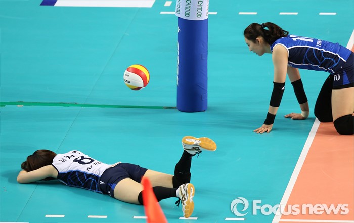 (화성=포커스뉴스) 17일 화성실내체육관에서 열린 2015-2016 V-리그 여자부 챔피언결정전 1차전 IBK기업은행-현대건설 경기에서 IBK기업은행 남지연과 박정아가 블로킹에 맞은 볼이 아웃되자 허탈해하고 있다.