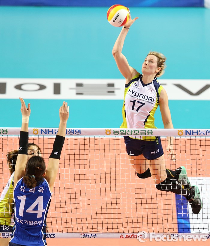 (화성=포커스뉴스) 17일 화성실내체육관에서 열린 2015-2016 V-리그 여자부 챔피언결정전 1차전 IBK기업은행-현대건설 경기에서 현대건설 에밀리가 후위공격으로 IBK기업은행의 블로킹을 무력화 시키고 있다.