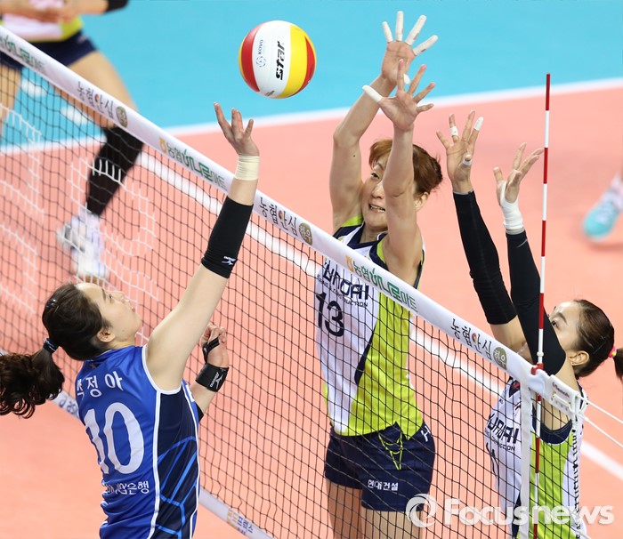 (화성=포커스뉴스) 17일 화성실내체육관에서 열린 2015-2016 V-리그 여자부 챔피언결정전 1차전 IBK기업은행-현대건설 경기에서 IBK기업은행 박정아가 현대건설 김세영과 한유미의 블로킹을 피해 연타로 공격하고 있다.