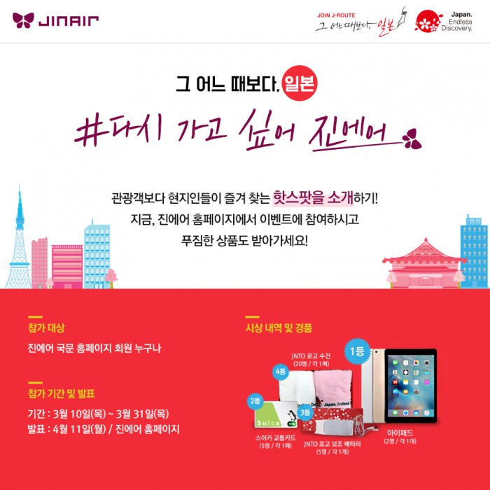 진에어 홈페이지 내 이벤트 게시물에 일본 오사카, 후쿠오카, 오키나와 등의숨겨진 명소나 축제 등을 촬영한 사진이나 소개글을 올리면 된다. 총 32명을 뽑아 태블릿PC, 보조배터리 등 경품을 지급한다.