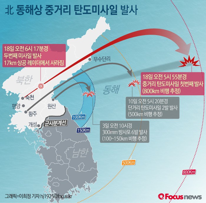 이날 북한이 첫 번째 발사한 미사일은 약 800km 정도를 비행한 것으로 파악되고 있으며, 중거리 노동미사일인 것으로 전했다.