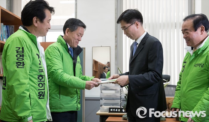 (서울=포커스뉴스) 18일 오전 서울 여의도 국회에서 국민의당 김영환(왼쪽부터) 인재영입위원장, 주승용 원내대표, 장병완 정책위의장이 국회의사국 관계자에게 원내교섭단체등록서를 제출하고 있다.
