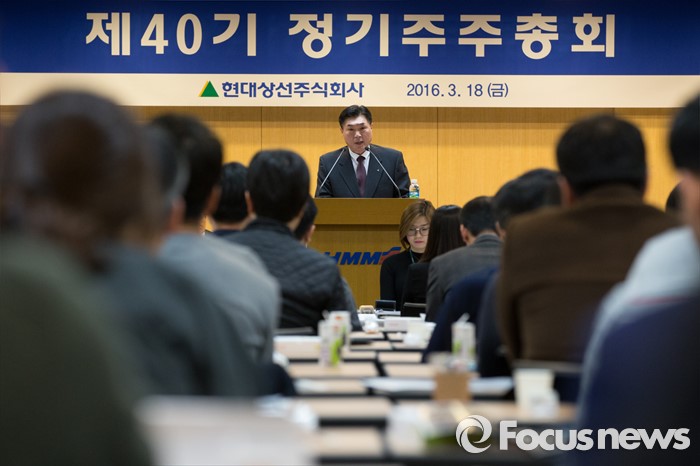 (서울=포커스뉴스) 이백훈 현대상선 대표이사가 18일 오전 서울 종로구 현대그룹빌딩에서 열린 제40기 정기주주총회에서 인사말을 하고 있다.