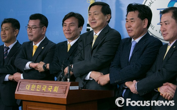 (서울=포커스뉴스) 더불어민주당을 탈당한 신기남(왼쪽 네번째) 의원이 18일 오전 서울 여의도 국회 정론관에서 원외 정당인 민주당 입당 기자회견을 마친 뒤 김민석(왼쪽 세번째) 민주당 대표 등 참석자들과 취재진을 향해 포즈를 취하고 있다.