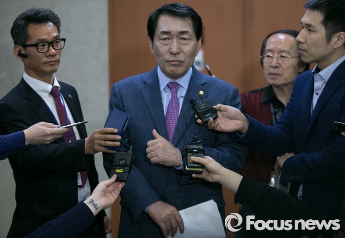 (서울=포커스뉴스) 공천 탈락한 안상수 새누리당 의원이 18일 오전 서울 여의도 국회 정론관에서 탈당 및 20대 총선 무소속 출마 기자회견을 마친 뒤 취재진 질문에 답하고 있다.