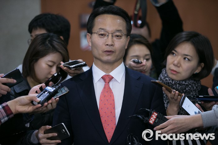 (서울=포커스뉴스) 공천 탈락한 조해진 새누리당 의원이 18일 오전 서울 여의도 국회 정론관에서 탈당 및 20대 총선 무소속 출마 기자회견을 마친 뒤 취재진 질문에 답하고 있다.