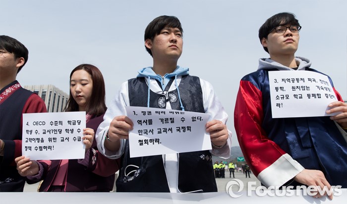 (서울=포커스뉴스) 18일 오전 서울 종로구 광화문광장에서 제4기 전국교육대학생연합이 한국사 국정화 교과서 폐기 및 공교육 정상화를 위한 예비교사 요구안 선언 기자회견을 하고 있다.