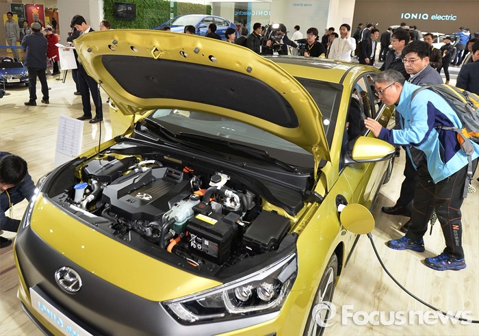 (제주=포커스뉴스) 18일 오전 제주 서귀포 제주국제컨벤션센터에서 열리고 있는 2016 국제전기자동차엑스포에서 관람객들이 현대 전기자동차 '아이오닉 일렉트릭'을 살펴보고 있다.