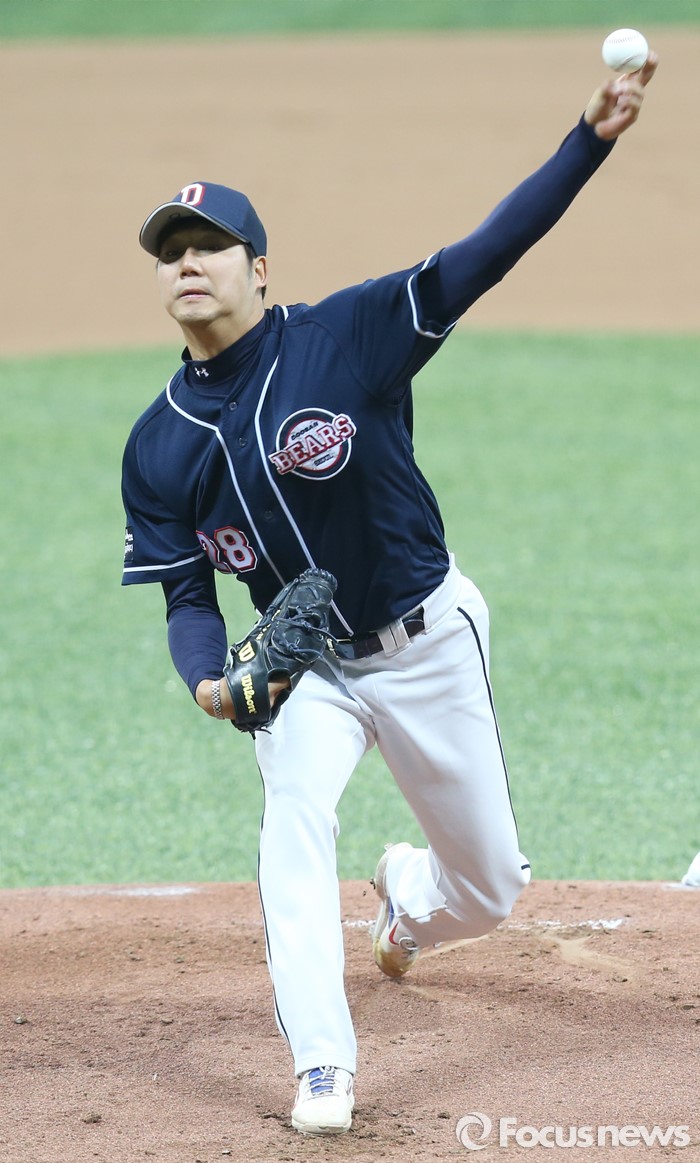 (서울=포커스뉴스) 18일 서울 고척스카이돔에서 열린 2016 프로야구 시범경기 두산-넥센 경기 1회말 두산 선발 장원준이 힘차게 투구하고 있다.
