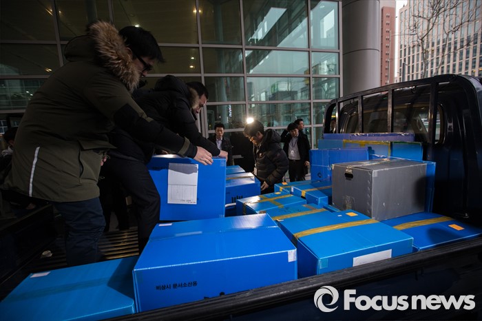 검찰은 이날 압수수색을 통해 컴퓨터 하드디스크, 차량판매 리스 관련 금융자료 등을 확보했다.검찰이 배출가스 조작 사건과 관련해 폭스바겐코리아 한국법인에 대한 압수수색에 나선 지난 2월 19일 오후 서울 강남구 아우디폭스바겐코리아 본사에서 검찰 관계자들이 압수품을 옮기고 있다. 강진형 기자