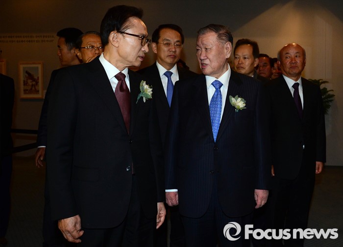 현대차그룹 관계자는 "특별한 상황이 없는 한 정몽구 회장과 정의선 부회장이 나란히 참석할 것으로 안다"고 전했다.(서울=포커스뉴스) 이명박(왼쪽) 전 대통령과 정몽구 현대자동차그룹 회장이 서울 용산구 그랜드 하얏트 서울 호텔에서 열린 정주영 현대그룹 명예회장의 탄생 100주년 기념식에 참석해 사진전을 둘러보고 있다. 2015.11.24 오장환 기자