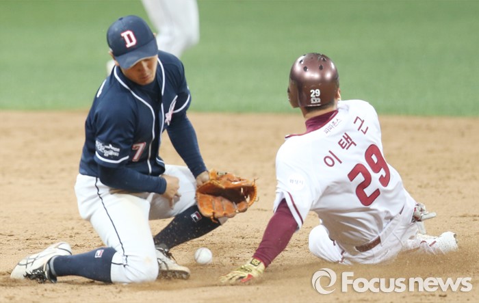(서울=포커스뉴스) 18일 서울 고척스카이돔에서 열린 2016 프로야구 시범경기 두산-넥센 경기 8회말 넥센 공격 무사 1,2루에서 더블스틸을 시도해 1루주자 이택근이 2루에서 세이프되고 있다.