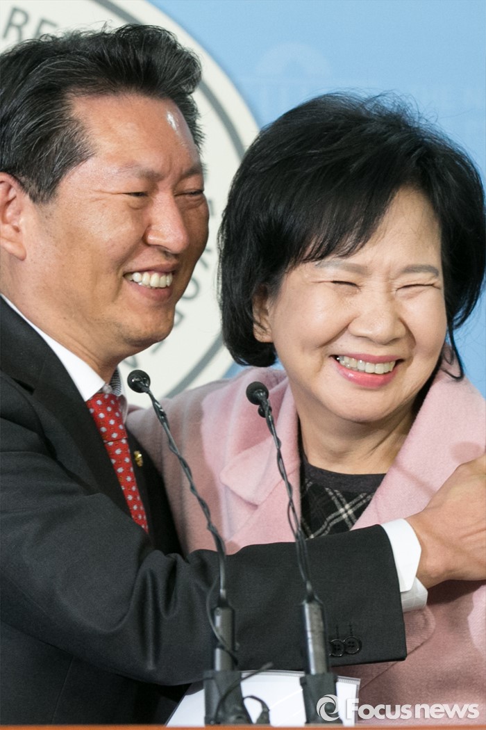 (서울=포커스뉴스) 손혜원(오른쪽) 더불어민주당 홍보위원장이 18일 오후 서울 여의도 국회 정론관에서 출마 기자회견을 마친 뒤, 정청래 의원과 포옹하고 있다. 한편, 손 위원장이 출마하게 될 서울 마포을 지역구는 공천 배제 된 정청래 의원 지역구이다.