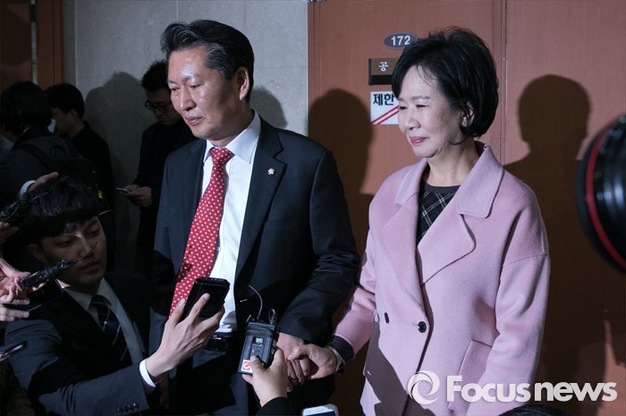 (서울=포커스뉴스) 손혜원(오른쪽) 더불어민주당 홍보위원장이 18일 오후 서울 여의도 국회 정론관에서 출마 기자회견을 마친 뒤, 정청래 의원과 기자질문에 답변하고 있다. 한편, 손 위원장이 출마하게 될 서울 마포을 지역구는 공천 배제 된 정 의원 지역구이다.