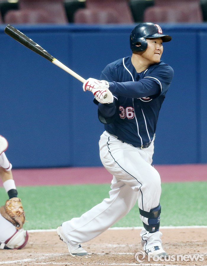 (서울=포커스뉴스) 18일 서울 고척스카이돔에서 열린 2016 프로야구 시범경기 두산-넥센 경기 7회초 두산 오재일이 중견수앞 안타를 때리고 있다.