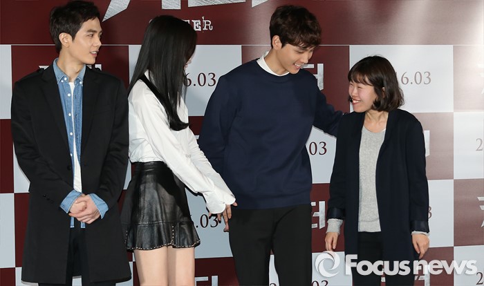 (서울=포커스뉴스) 18일 오후 서울 성동구 왕십리CGV에서 열린 영화 '커터' 언론시사회에 참석한 배우 김시후(왼쪽부터), 문가영,최태준이 포토타임을 위해 이동하는 정희성 감독을 맞이하고 있다.