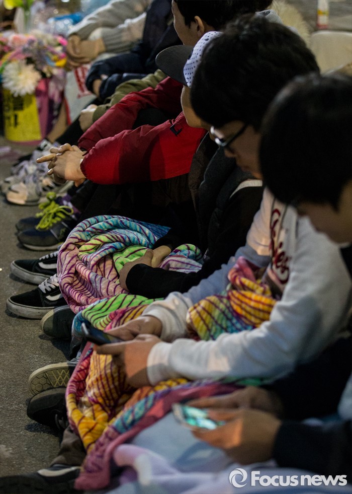 (서울=포커스뉴스) 18일 오전 서울 종로구 일본대사관 앞에서 열린 '한일 위안부 합의 폐기, 소녀상 철거 반대 대학생 100인 농성'에 참석한 학생들이 SNS로 참여를 독려하고 있다.