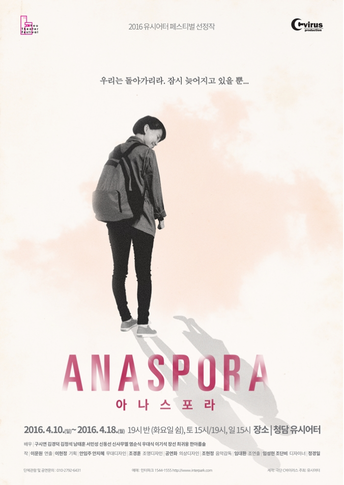 2016 유시어터 페스티벌 선정작인 연극 '아나스포라'는 오는 4월10일부터 18일까지 서울 강남구 유시어터에서 공연된다. 가격은 일반 3만원이다.연극 '아나스포라' 포스터.<사진제공=극단 C바이러스>