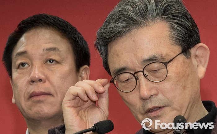 (서울=포커스뉴스) 이한구 공천관리위원장이 박종희 공관위원과 함께 19일 오후 서울 영등포구 새누리당사에서 총선 공천을 위한 여론조사 경선 결과를 발표하고 있다.