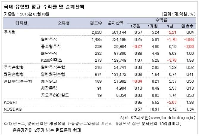 20일 펀드평가사 KG제로인이 지난 18일 공시된 기준 가격으로 펀드 수익률을 조사한 결과, 전체 국내 주식형펀드는 한 주간 0.57% 상승했다.