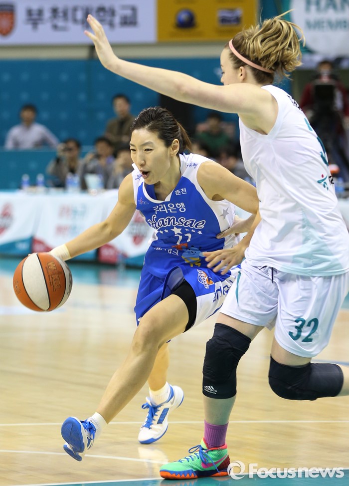 (부천=포커스뉴스) 20일 부천체육관에서 열린 2015-2016 여자프로농구 챔피언결전전 3차전 KEB하나은행-우리은행 경기에서 우리은행 임영희가 KEB하나 리스턴의 수비를 제치며 돌파를 시도하고 있다.