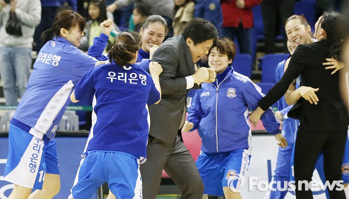 (부천=포커스뉴스) 20일 부천체육관에서 열린 2015-2016 여자프로농구 챔피언결정전 3차전에서 승리하며 KEB하나에게 3승으로 통합챔피언을 차지한 우리은행 선수들이 박성배, 전주원 코치와 얼싸안으며 환호하고 있다.
