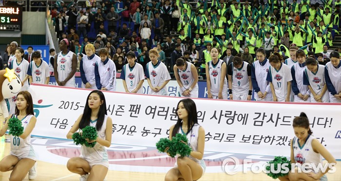 (부천=포커스뉴스) 20일 부천체육관에서 열린 2015-2016 여자프로농구 챔피언결정전에서 우리은행에게 우승을 내주고 준우승한 KEB하나 선수들이 관중에게 인사하고 있다.