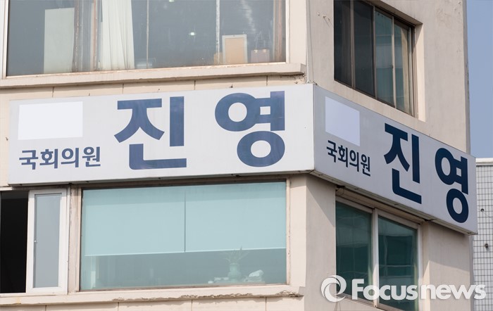 (서울=포커스뉴스) 21일 오전 서울 용산구 진영 의원 지역구 사무실 간판의 정당과 기호 표시가 가려져 있다. 진 의원은 새누리당에서 공첸 배제된 뒤 탈당해 더불어민주당으로 입당했다.